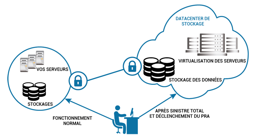 Le service PRA (Plan de Reprise d’Activité) vous offre la possibilité de sécuriser très simplement votre infrastructure IT et redémarrer votre activité d’une manière très rapide en cas de panne, incident ou sinistre en fonction des paramètres définis en amont.